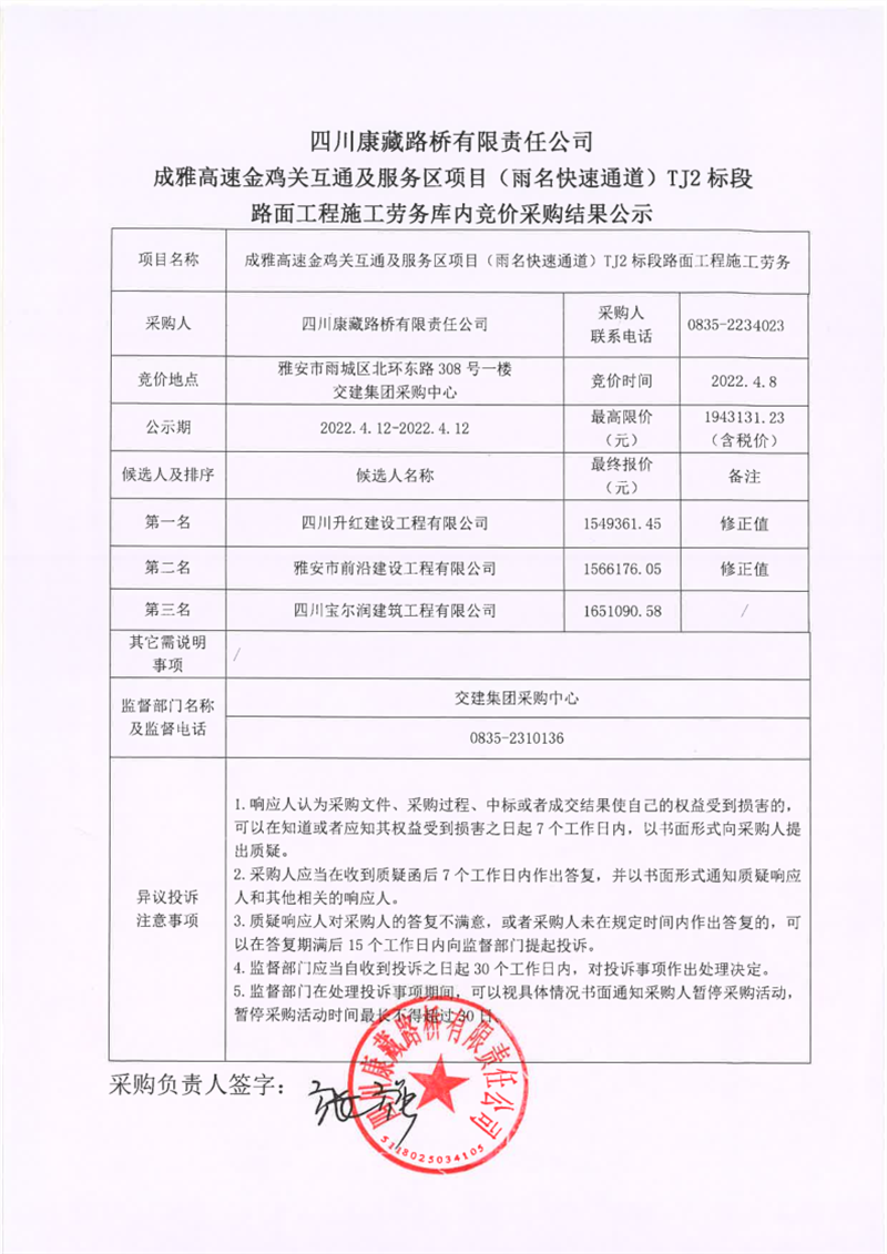 四川康藏路橋有限責任公司成雅高速金雞關(guān)互通及服務(wù)區(qū)項目(雨名快速通道)TJ2標段路面工程施工勞務(wù)庫內(nèi)競價采購結(jié)果公示