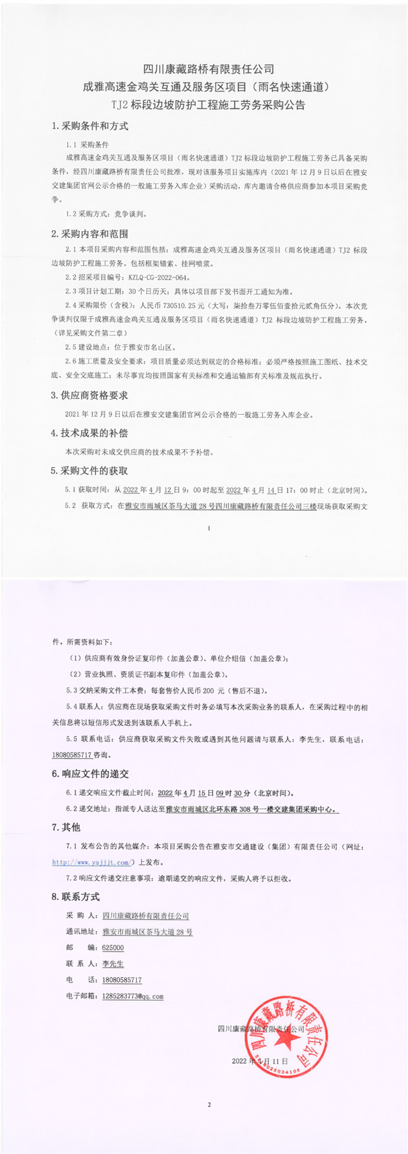 四川康藏路橋有限責(zé)任公司成雅高速金雞關(guān)互通及服務(wù)區(qū)項(xiàng)目(雨名快速通道)TJ2標(biāo)段邊坡防護(hù)工程施工勞務(wù)采購公告