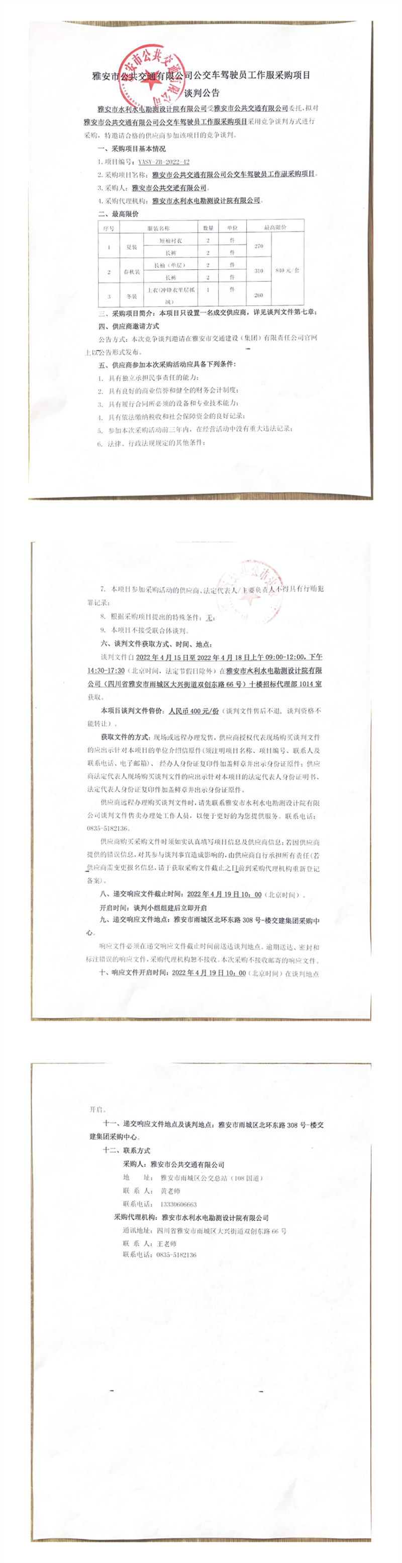 雅安市公共交通有限公司公交車駕駛員工作服采購項目談判公告