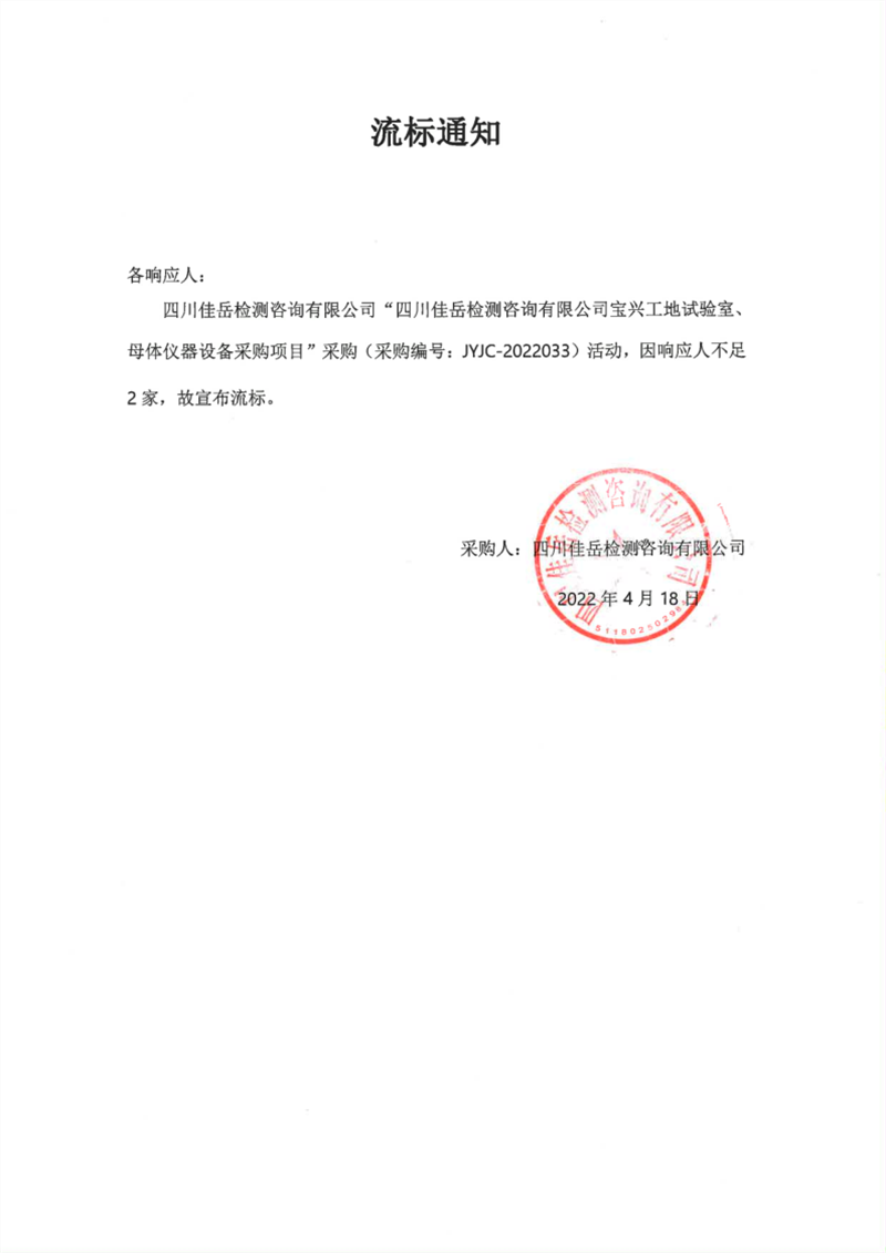 四川佳岳檢測(cè)咨詢(xún)有限公司寶興工地試驗(yàn)室、母體儀器設(shè)備采購(gòu)項(xiàng)目流標(biāo)通知