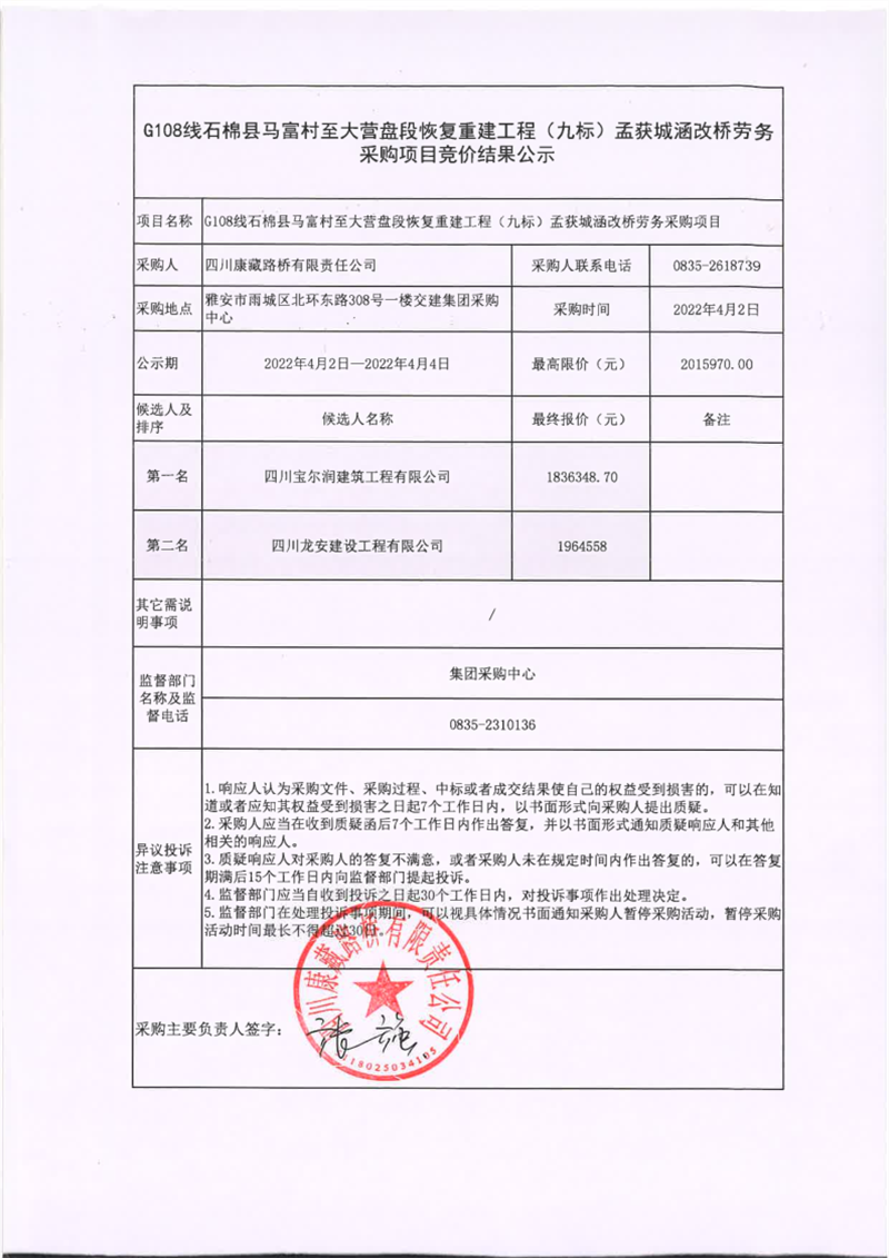 四川康藏路橋有限責(zé)任公司G108線石棉縣馬富村至大營盤段恢復(fù)重建工程(九標(biāo))孟獲城涵改橋勞務(wù)采購項(xiàng)目競價結(jié)果公示