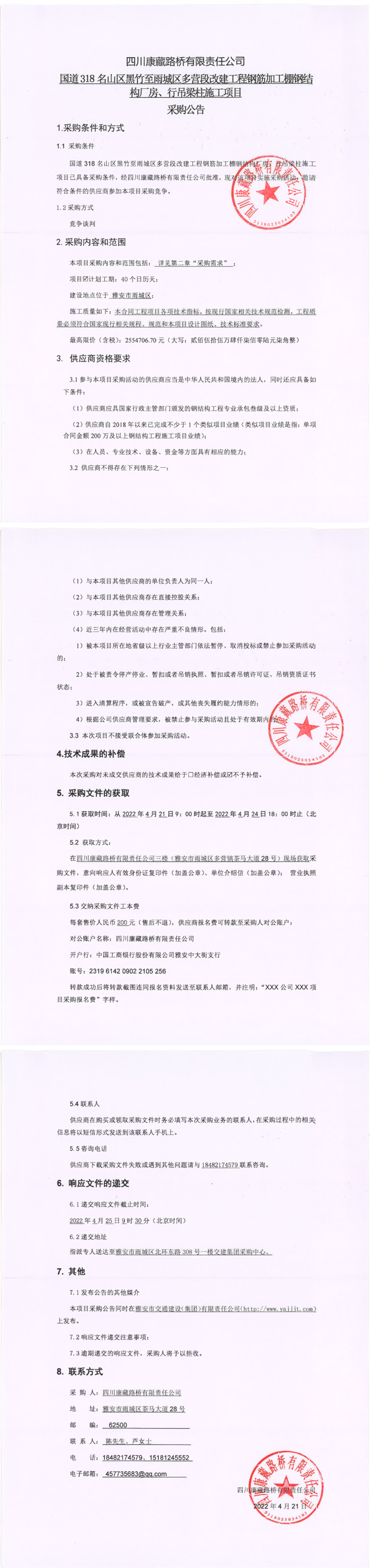 四川康藏路橋有限責(zé)任公司國道318名山區(qū)黑竹至雨城區(qū)多營段改建工程鋼筋加工棚鋼結(jié)構(gòu)廠房、行吊梁柱施工項(xiàng)目采購公告