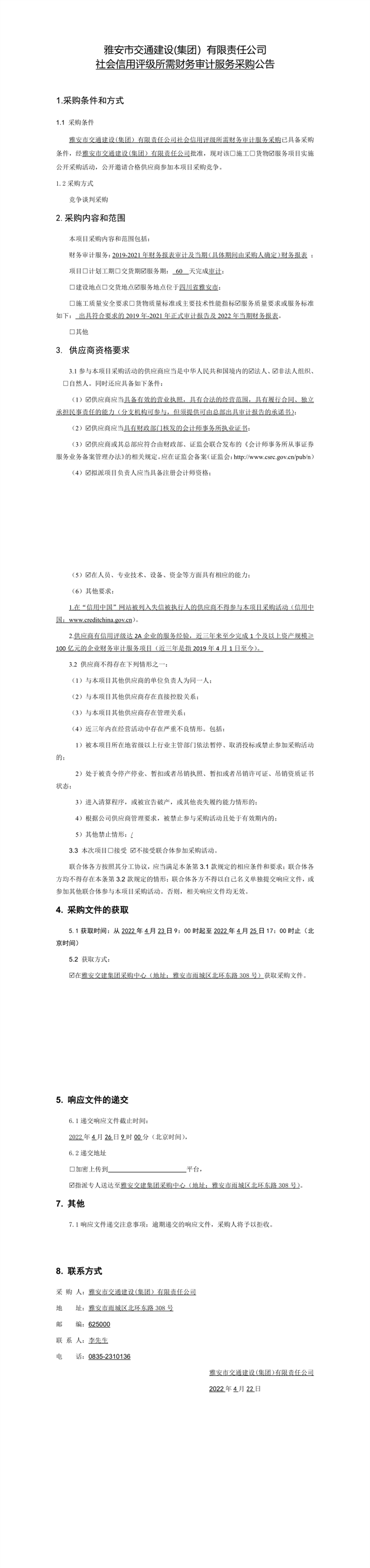 雅安市交通建設(集團)有限責任公司社會信用評級所需財務審計服務采購公告