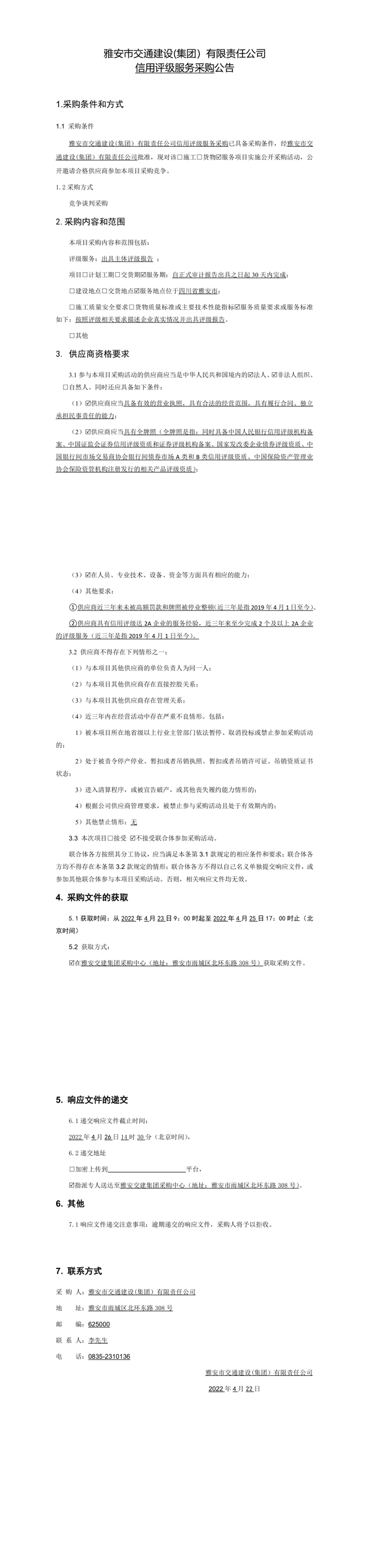 雅安市交通建設(shè)(集團(tuán))有限責(zé)任公司信用評級服務(wù)采購公告