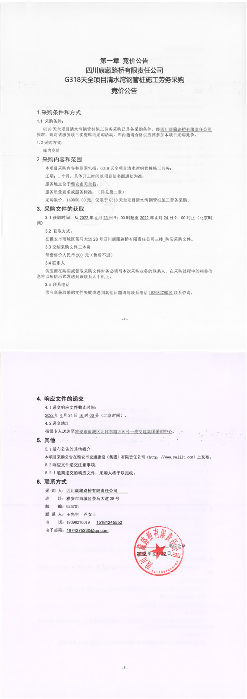 四川康藏路橋有限責任公司G318天全項目清水灣鋼管樁施工勞務采購競價公告