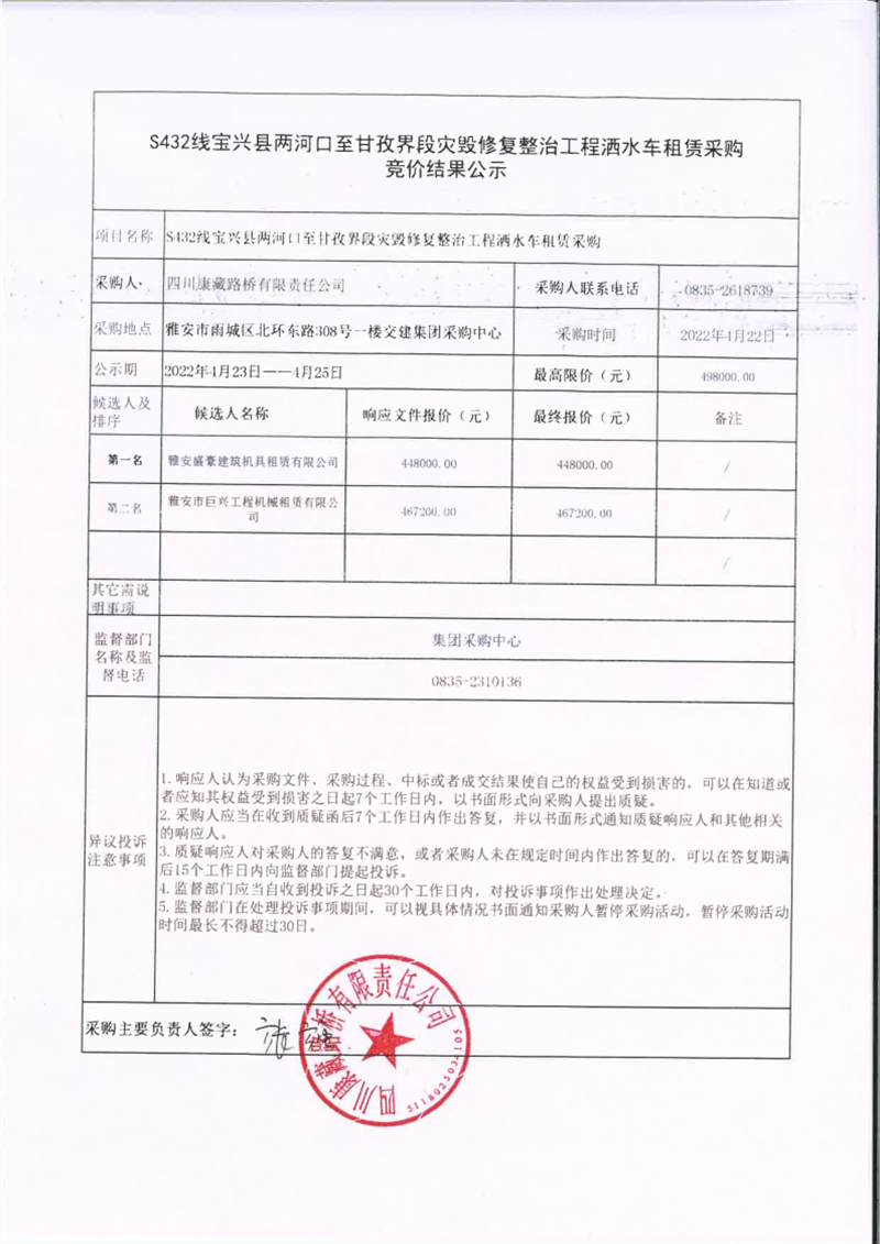 四川康藏路橋有限責任公司S432線寶興縣兩河口至甘孜界段災毀修復整治工程灑水車租賃采購競價結果公示