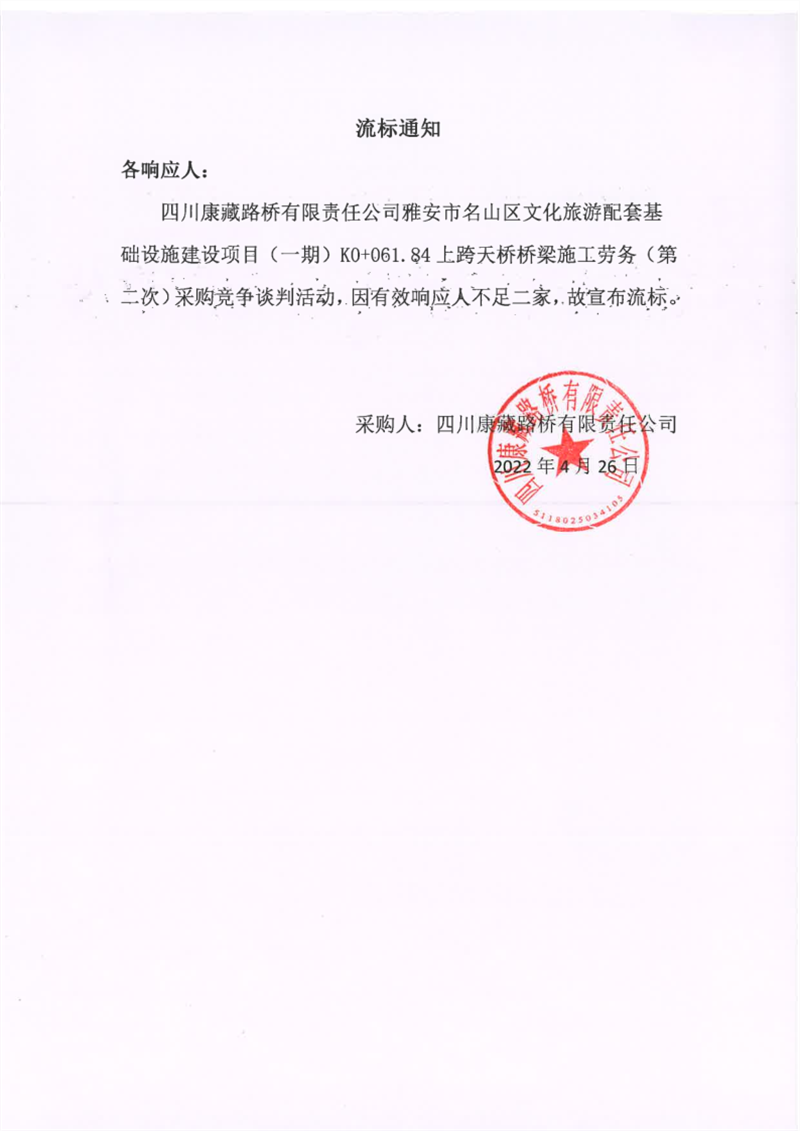 四川康藏路橋有限責(zé)任公司雅安市名山區(qū)文化旅游配套基礎(chǔ)設(shè)施建設(shè)項目(一期)K0+061.84上跨天橋橋梁施工勞務(wù)(第二次)流標通知