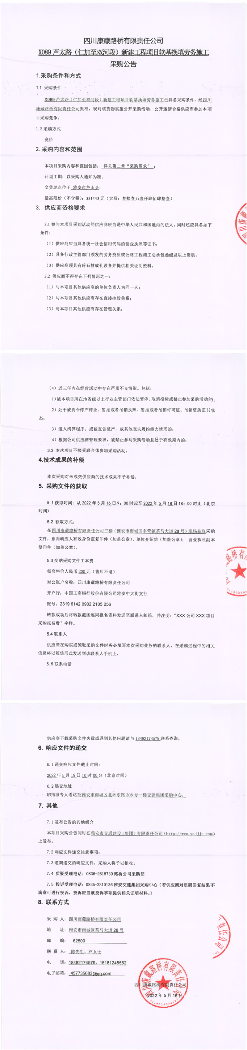 四川康藏路橋有限責(zé)任公司X089蘆太路(仁加至雙河段)新建工程項(xiàng)目軟基換填勞務(wù)施工采購(gòu)公告