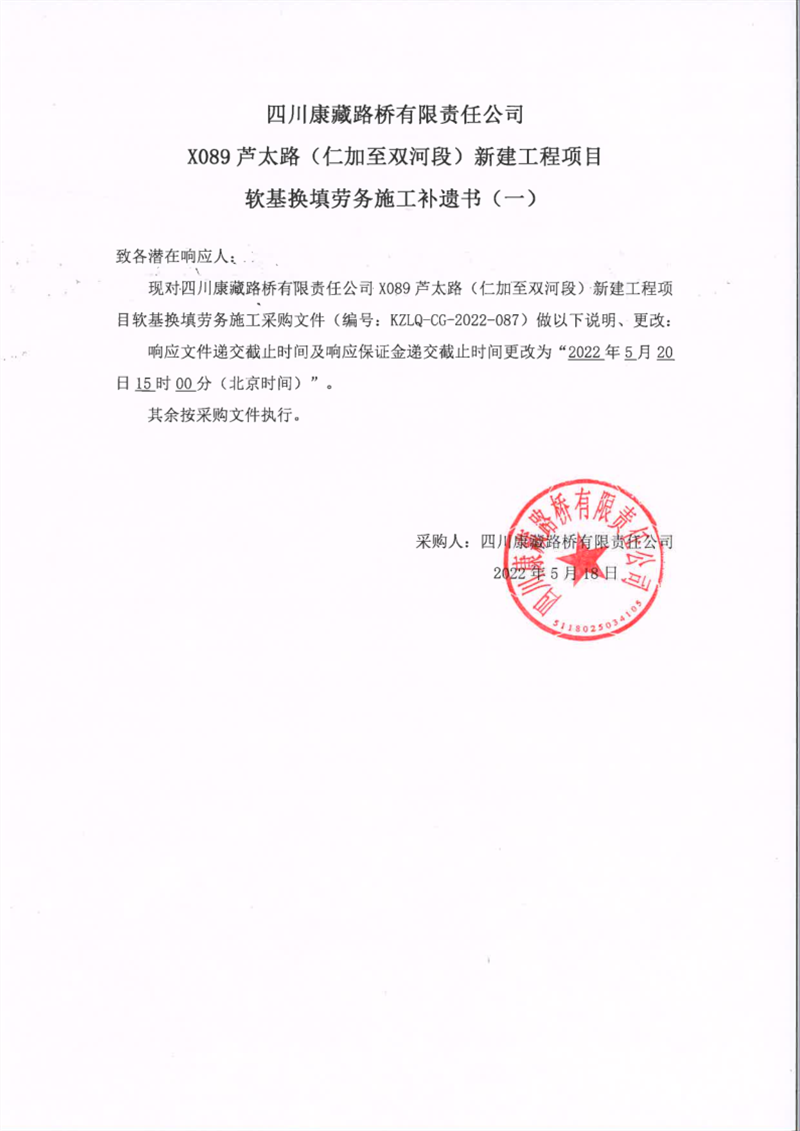 四川康藏路橋有限責(zé)任公司X089蘆太路(仁加至雙河段)新建工程項目軟基換填勞務(wù)施工補遺書(一)