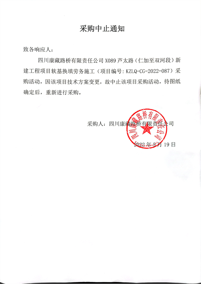 四川康藏路橋有限責(zé)任公司X089蘆太路(仁加至雙河段)新建工程項目軟基換填勞務(wù)施工采購中止通知