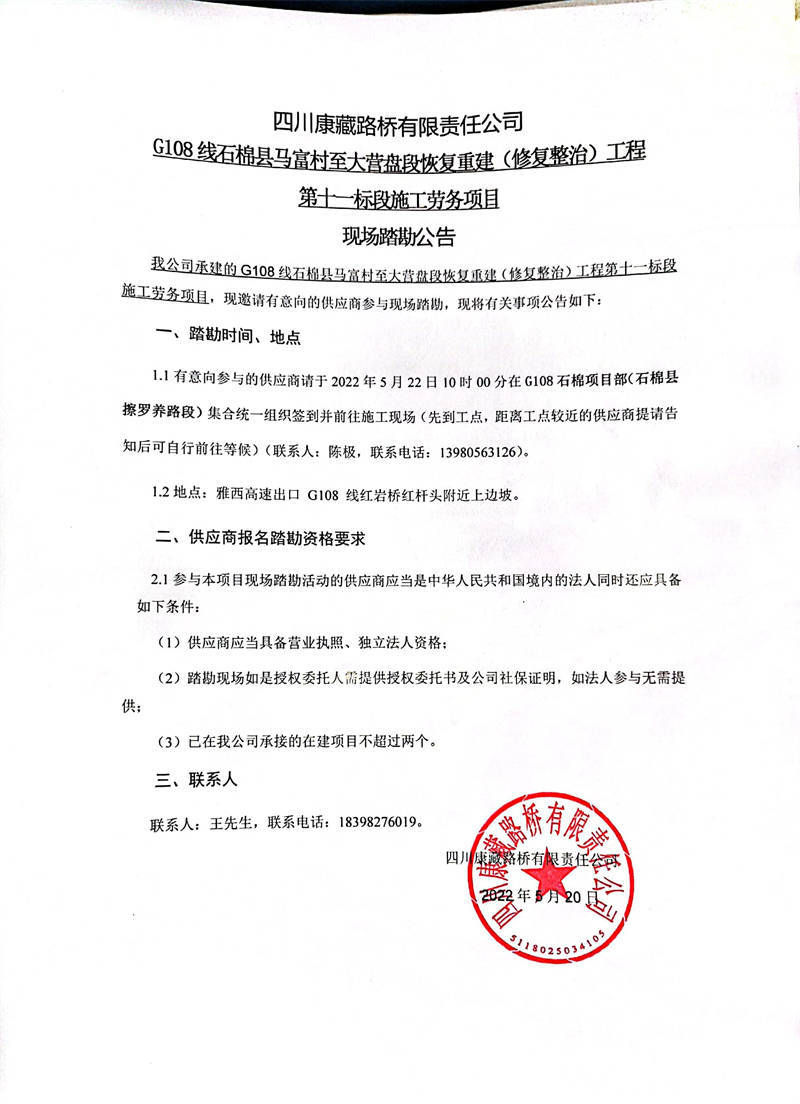 四川康藏路橋有限責任公司G108線石棉縣馬福村至大營盤段恢復重建(修復整治)工程第十一標段施工勞務項目現場踏勘公告