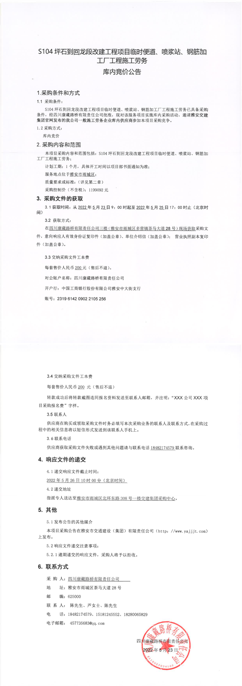 四川康藏路橋有限責(zé)任公司S104坪石到回龍段改建工程項(xiàng)目臨時(shí)便道、噴漿站、鋼筋加工廠工程施工勞務(wù)庫(kù)內(nèi)競(jìng)價(jià)公告