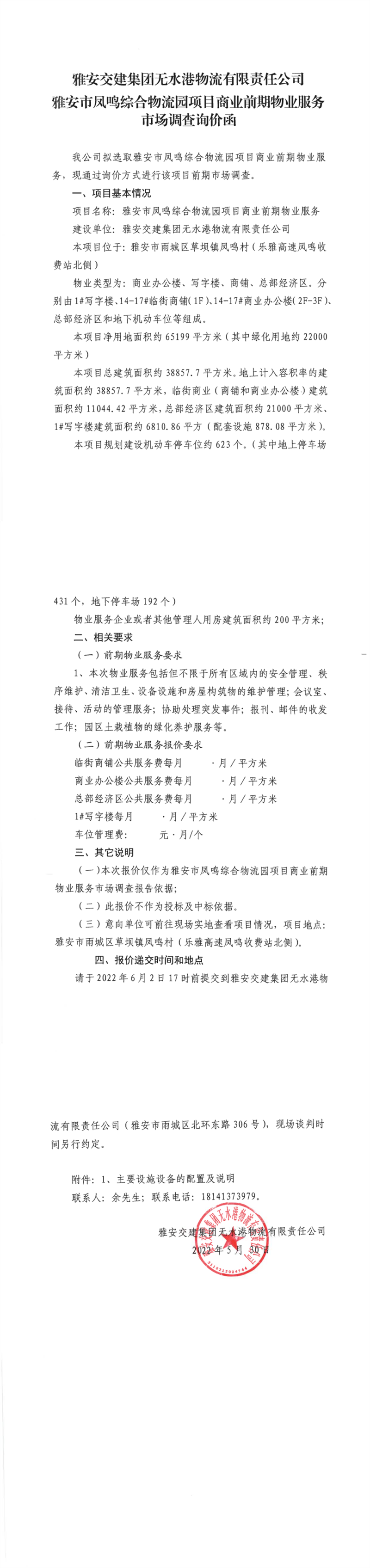 雅安交建集團無水港物流有限責(zé)任公司雅安市鳳鳴綜合物流園項目商業(yè)前期物業(yè)服務(wù)市場調(diào)查詢價函