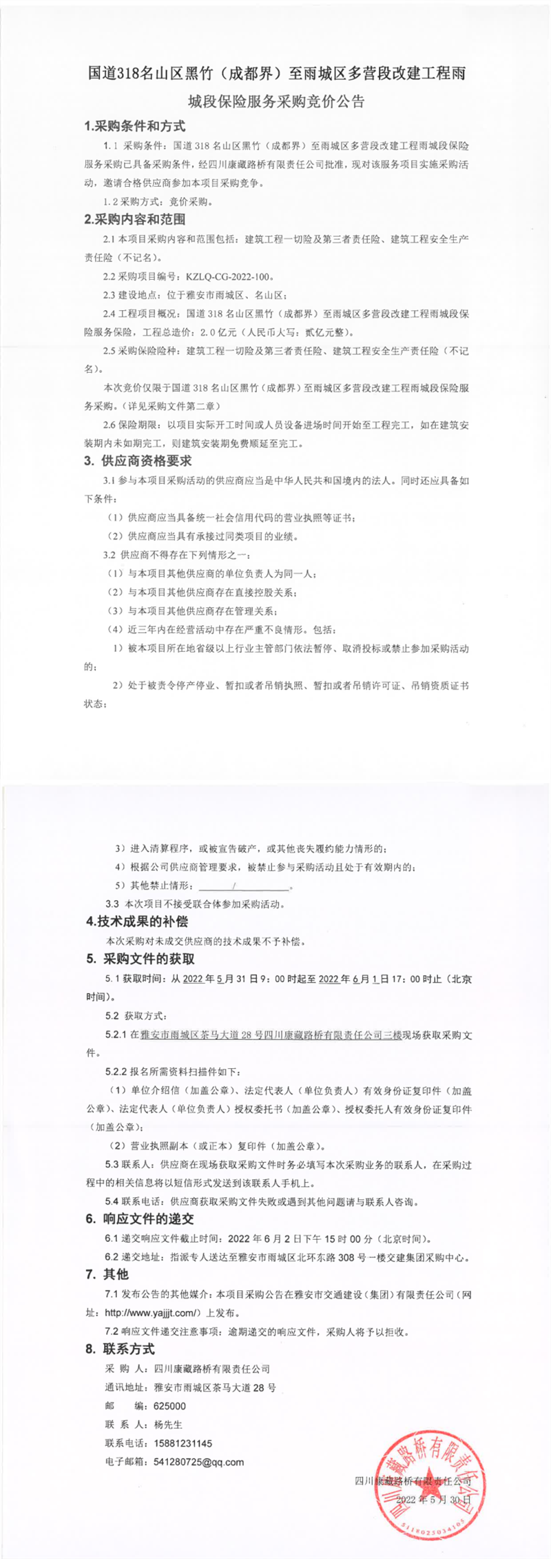 四川康藏路橋有限責任公司國道318名山區(qū)黑竹(成都界)至雨城區(qū)多營段改建工程雨城段保險服務(wù)采購競價公告