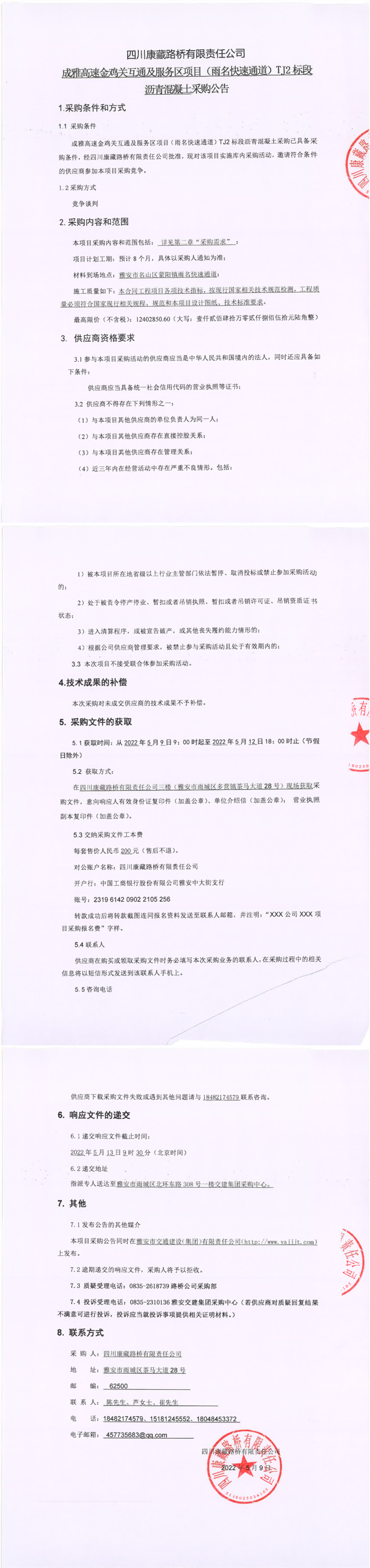 四川康藏路橋有限責任公司成雅高速金雞關互通及服務區(qū)項目(雨名快速通道)TJ2標段瀝青混凝土采購公告