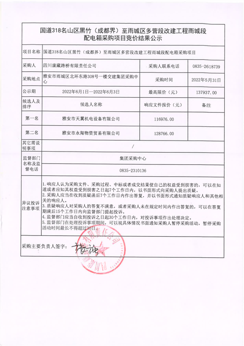 四川康藏路橋有限責(zé)任公司國道318名山區(qū)黑竹(成都界)至雨城區(qū)多營段改建工程雨城段配電箱采購項目競價結(jié)果公示
