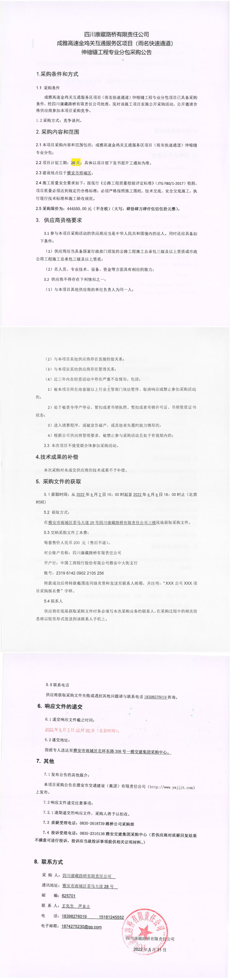 四川康藏路橋有限責(zé)任公司成雅高速金雞關(guān)互通服務(wù)區(qū)項目(雨名快速通道)伸縮縫工程專業(yè)分包采購公告
