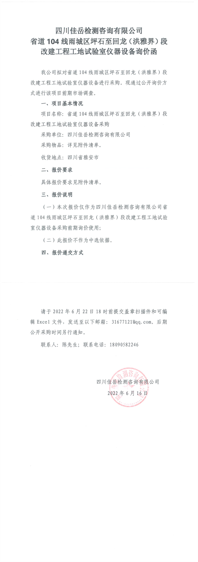 四川佳岳檢測咨詢有限公司省道104線雨城區(qū)坪石至回龍(洪雅界)段改建工程工地試驗室儀器設備詢價函