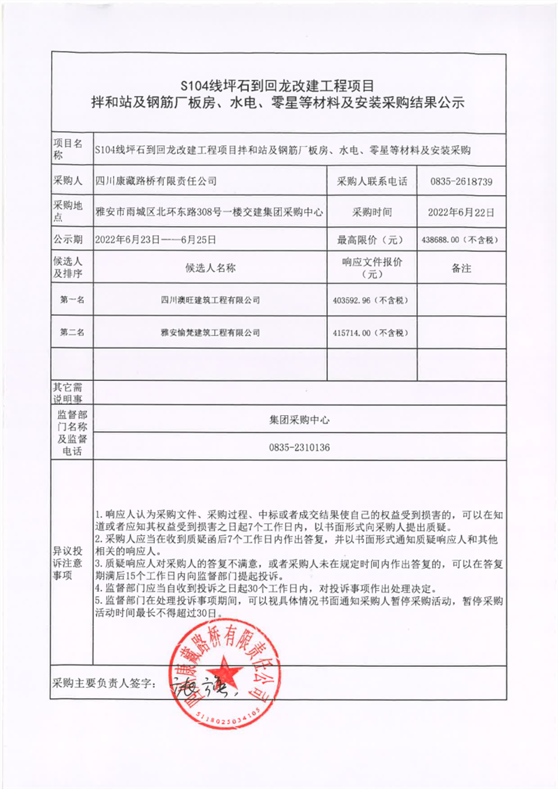 四川康藏路橋有限責(zé)任公司S104線坪石到回龍改建工程項(xiàng)目拌和站及鋼筋廠板房、水電、零星等材料及安裝采購結(jié)果公示