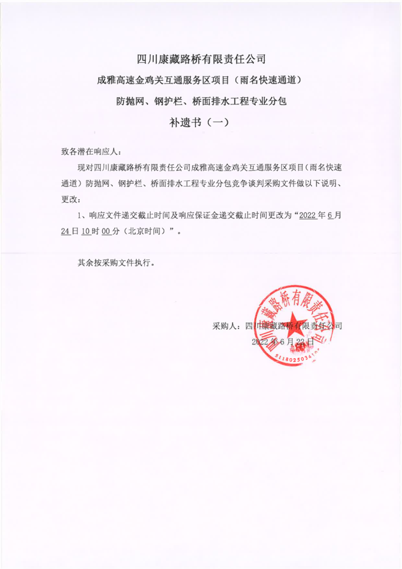 四川康藏路橋有限責(zé)任公司成雅高速金雞關(guān)互通服務(wù)區(qū)項(xiàng)目(雨名快速通道)防拋網(wǎng)、鋼護(hù)欄、橋面排水工程專業(yè)分包補(bǔ)遺書(一)