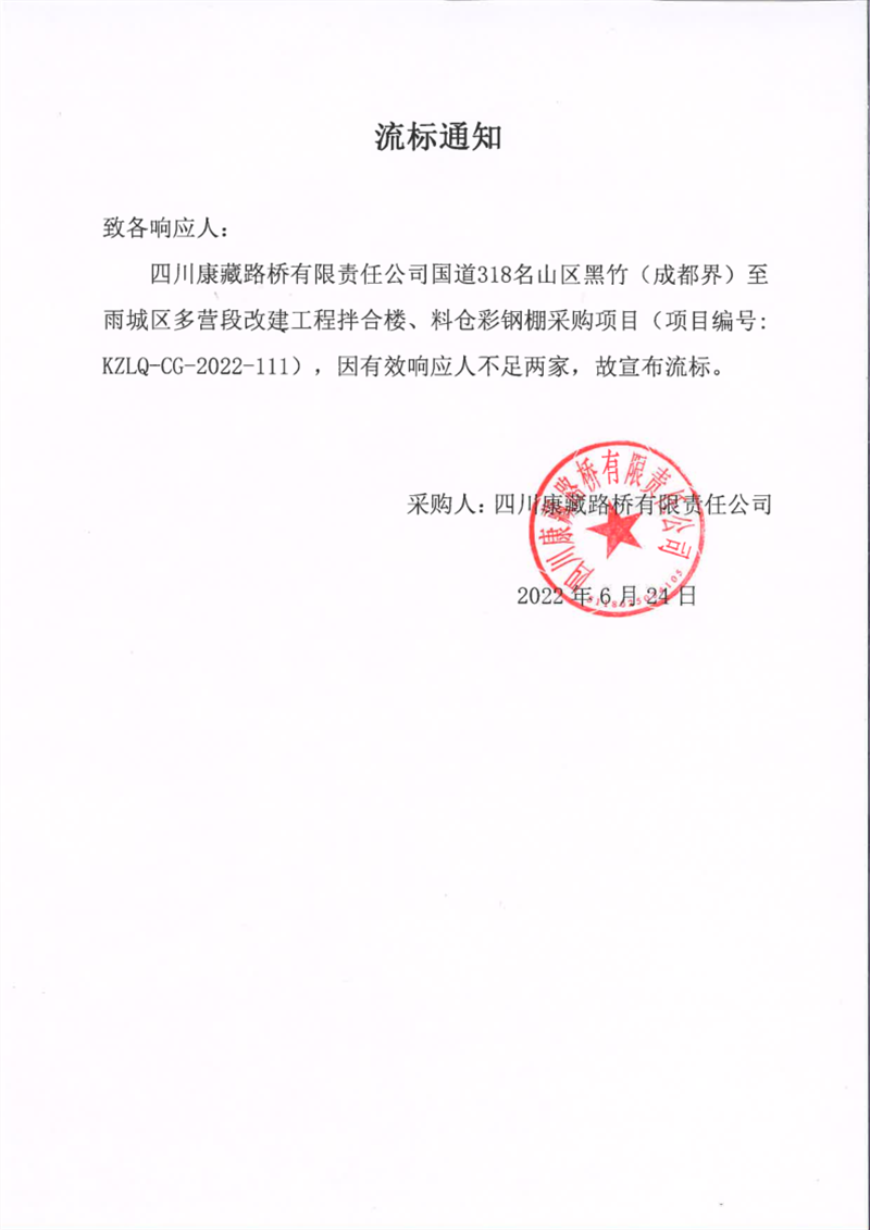 四川康藏路橋有限責(zé)任公司國(guó)道318名山區(qū)黑竹(成都界)至雨城區(qū)多營(yíng)段改建工程拌合樓、料倉(cāng)彩鋼棚采購(gòu)項(xiàng)目流標(biāo)通知