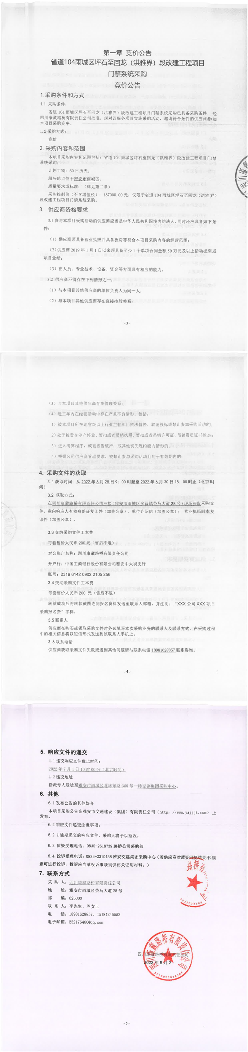 四川康藏路橋有限責(zé)任公司省道104雨城區(qū)坪石至回龍(洪雅界)段改建工程項(xiàng)目門禁系統(tǒng)采購(gòu)