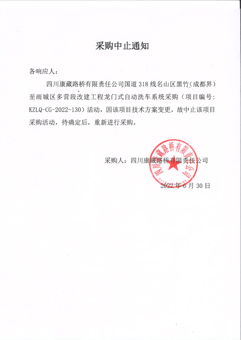 四川康藏路橋有限責(zé)任公司國道318線名山區(qū)黑竹(成都界)至雨城區(qū)多營段改建工程龍門式自動(dòng)洗車系統(tǒng)采購中止通知