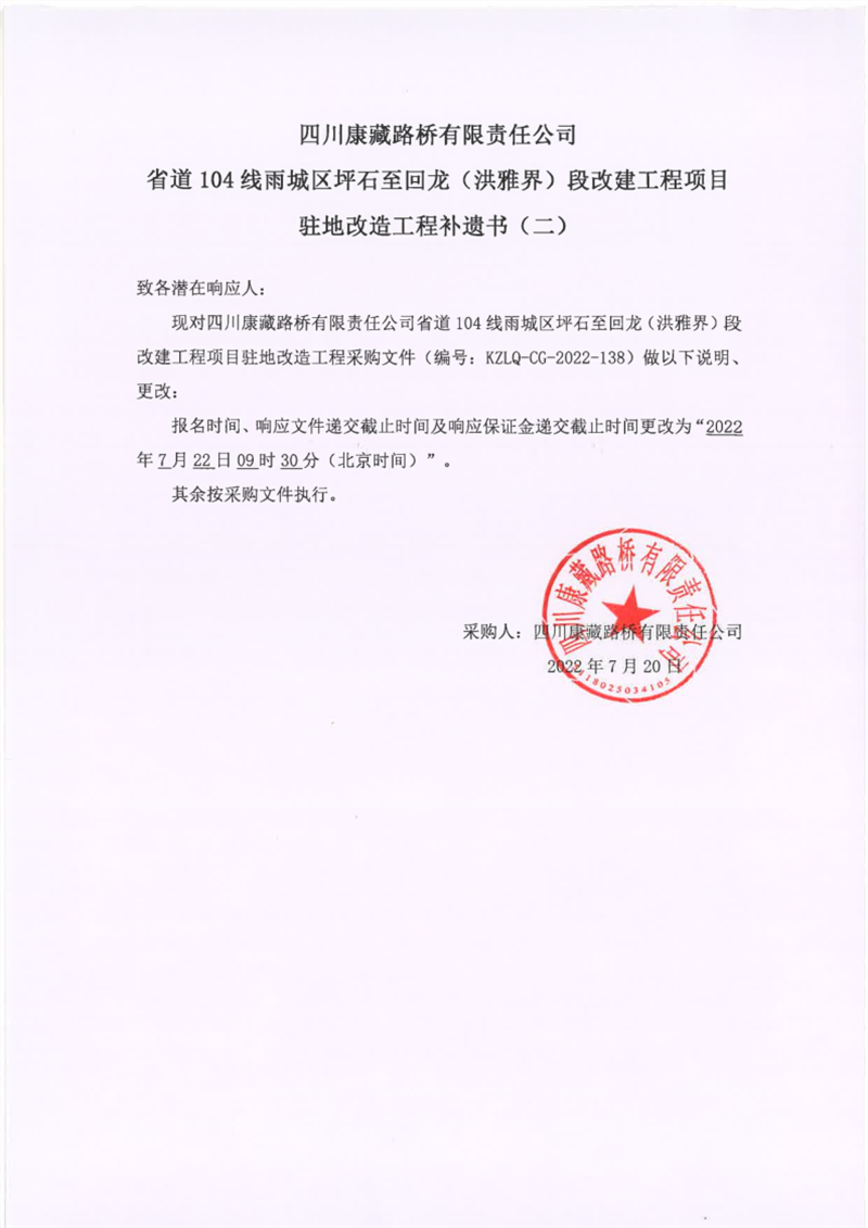 四川康藏路橋有限責任公司省道104線雨城區(qū)坪石至回龍(洪雅界)段改建工程項目駐地改造工程補遺書(二)