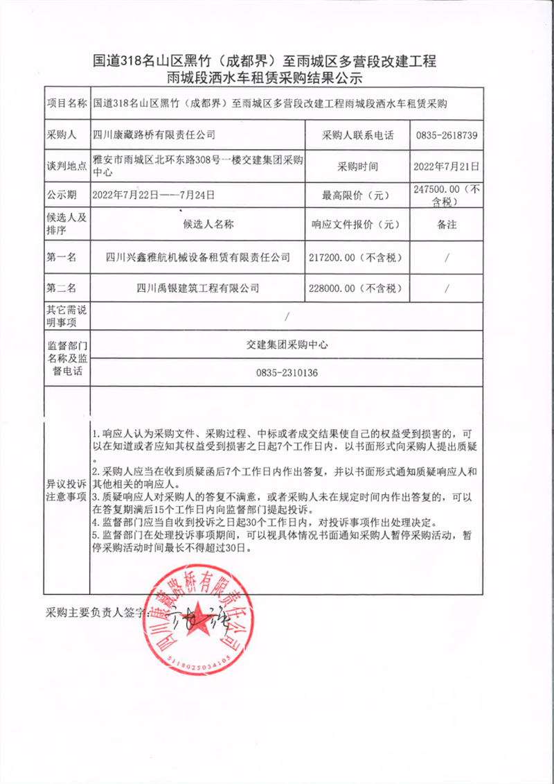 四川康藏路橋有限責(zé)任公司國(guó)道318名山區(qū)黑竹(成都界)至雨城區(qū)多營(yíng)段改建工程雨城段灑水車(chē)租賃采購(gòu)結(jié)果公示