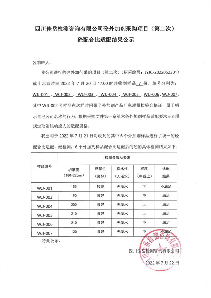 四川佳岳檢測咨詢有限公司砼外加劑采購項(xiàng)目(第二次)砼配合比適配結(jié)果公示