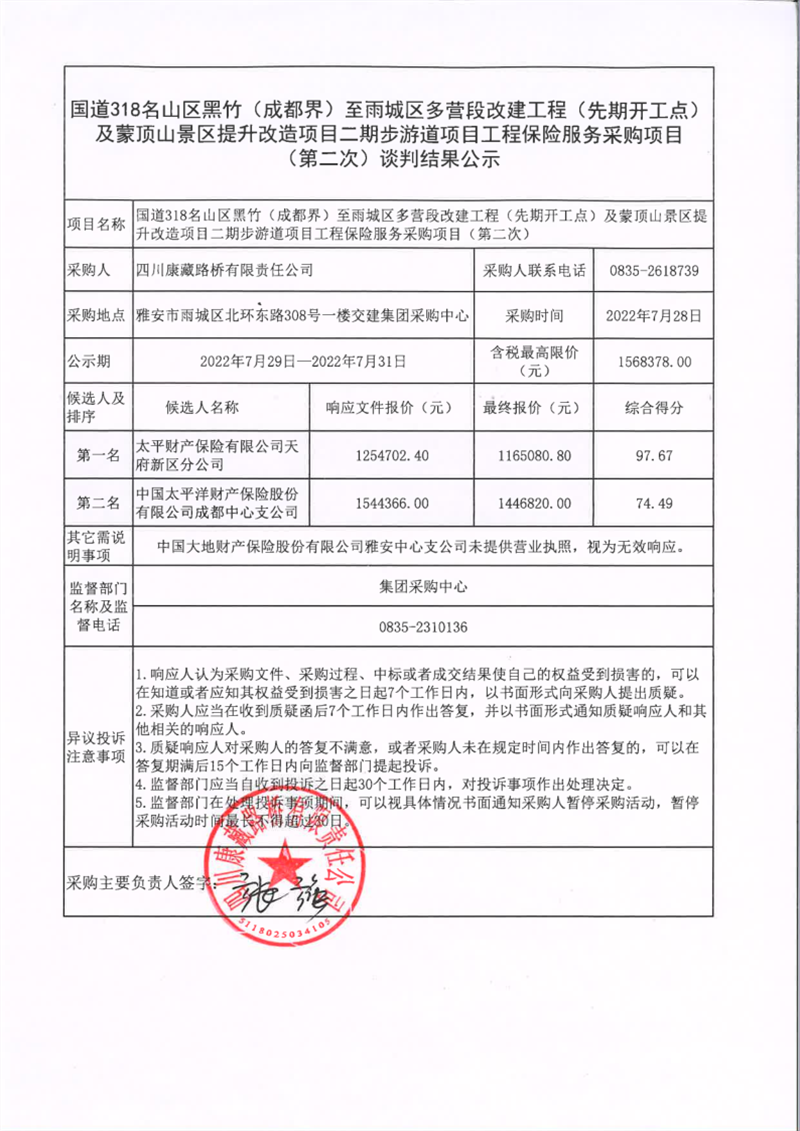 四川康藏路橋有限責任公司國道318名山區(qū)黑竹(成都界)至雨城區(qū)多營段改建工程(先期開工點)及蒙頂山景區(qū)提升改造項目二期步游道項目工程保險服務(wù)采購項目(第二次)談判結(jié)果公示