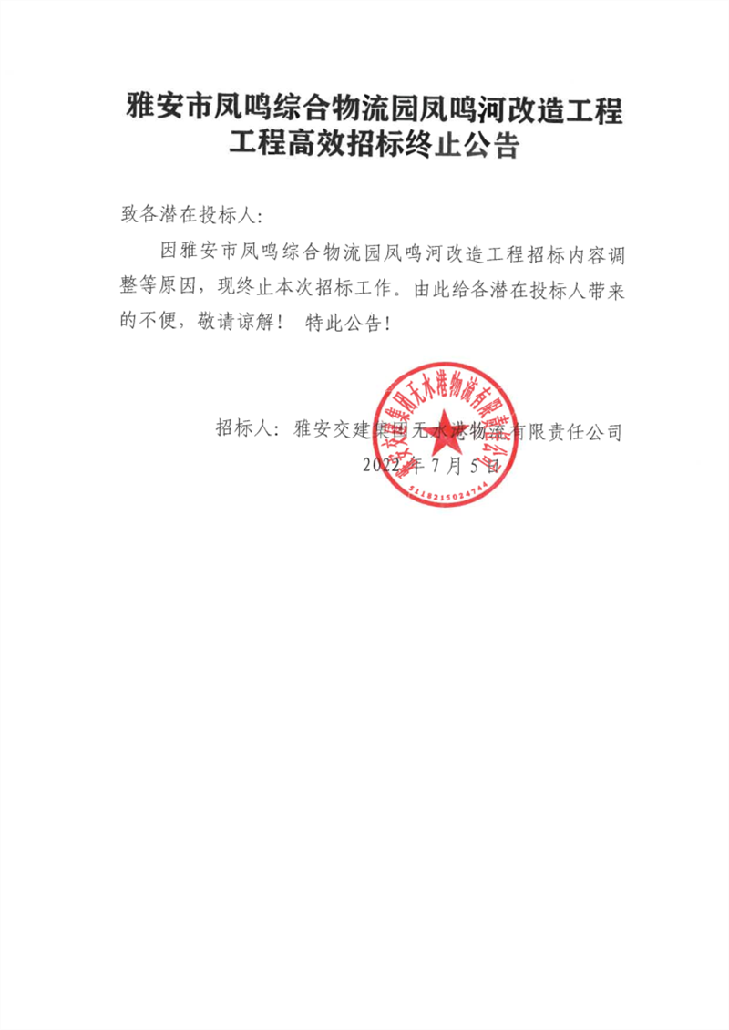 雅安交建集團(tuán)無(wú)水港物流有限責(zé)任公司雅安市鳳鳴綜合物流園鳳鳴河改造工程高效招標(biāo)終止公告