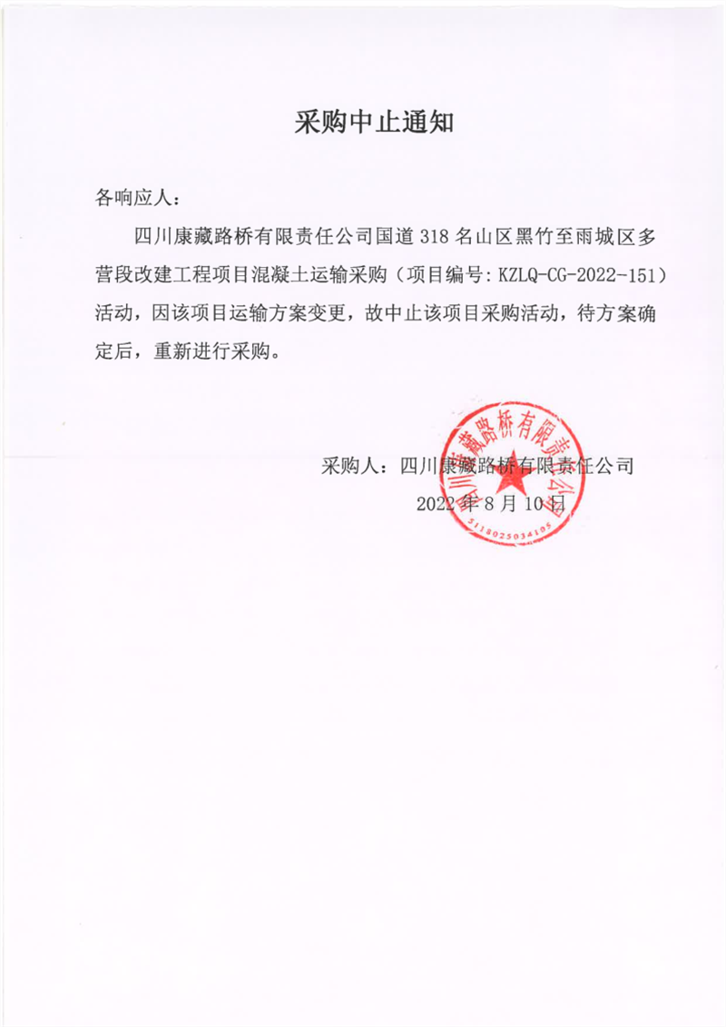 四川康藏路橋有限責(zé)任公司國道318名山區(qū)黑竹至雨城區(qū)多營段改建工程項(xiàng)目混凝土運(yùn)輸采購中止通知
