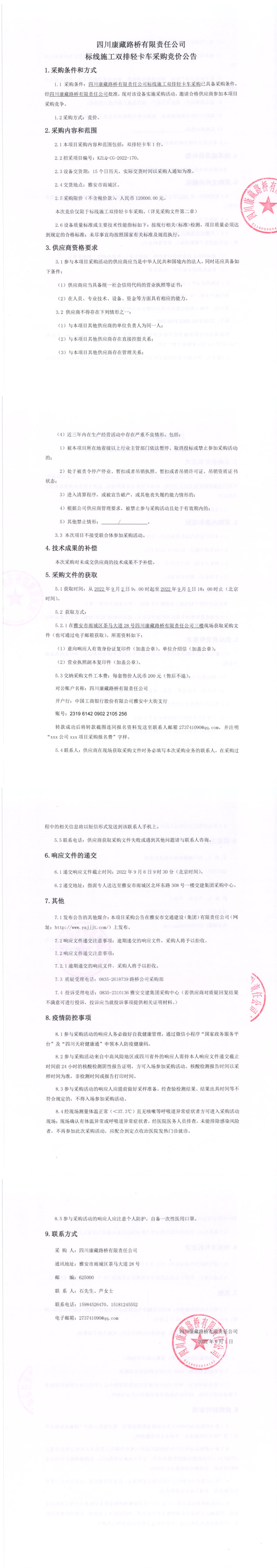 四川康藏路橋有限責任公司標線施工雙排輕卡車采購競價公告