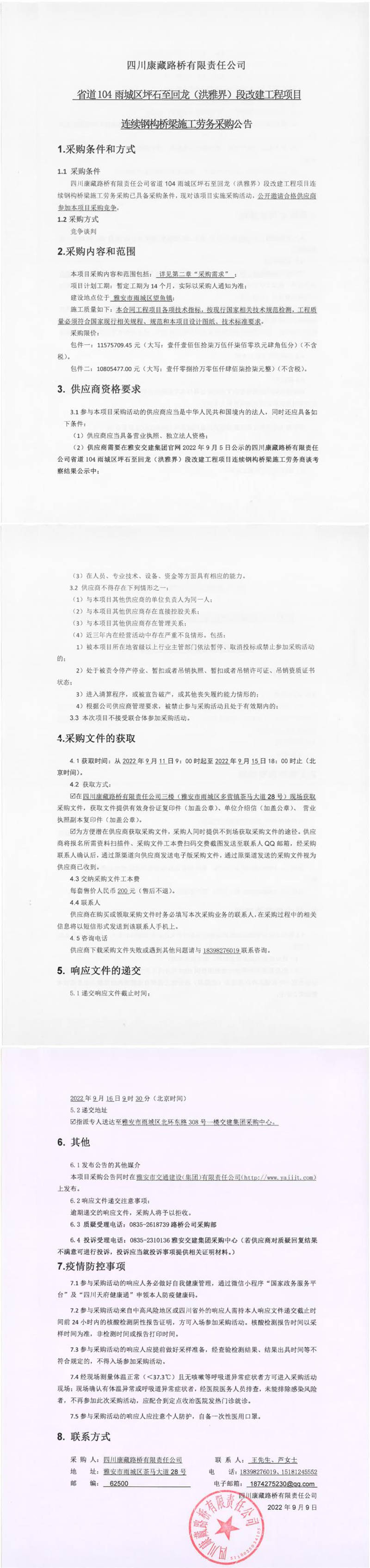 四川康藏路橋有限責(zé)任公司省道104雨城區(qū)坪石至回龍(洪雅界)段改建工程項(xiàng)目連續(xù)鋼構(gòu)橋梁施工勞務(wù)采購公告