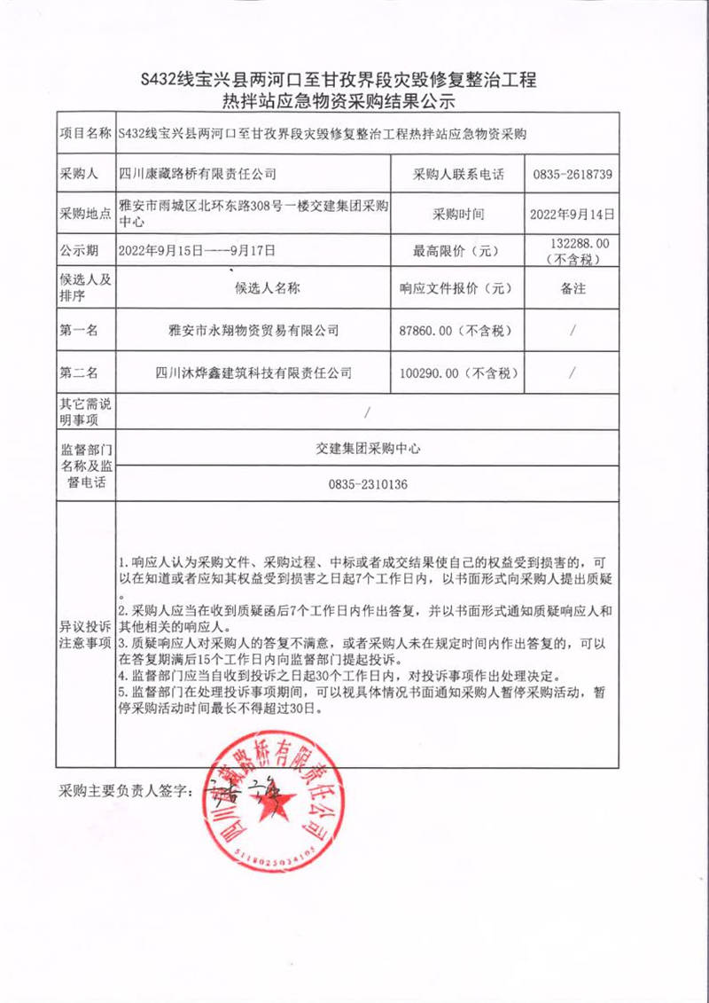 四川康藏路橋有限責(zé)任公司S432線寶興縣兩河口至甘孜界段災(zāi)毀修復(fù)整治工程熱拌站應(yīng)急物資采購結(jié)果公示