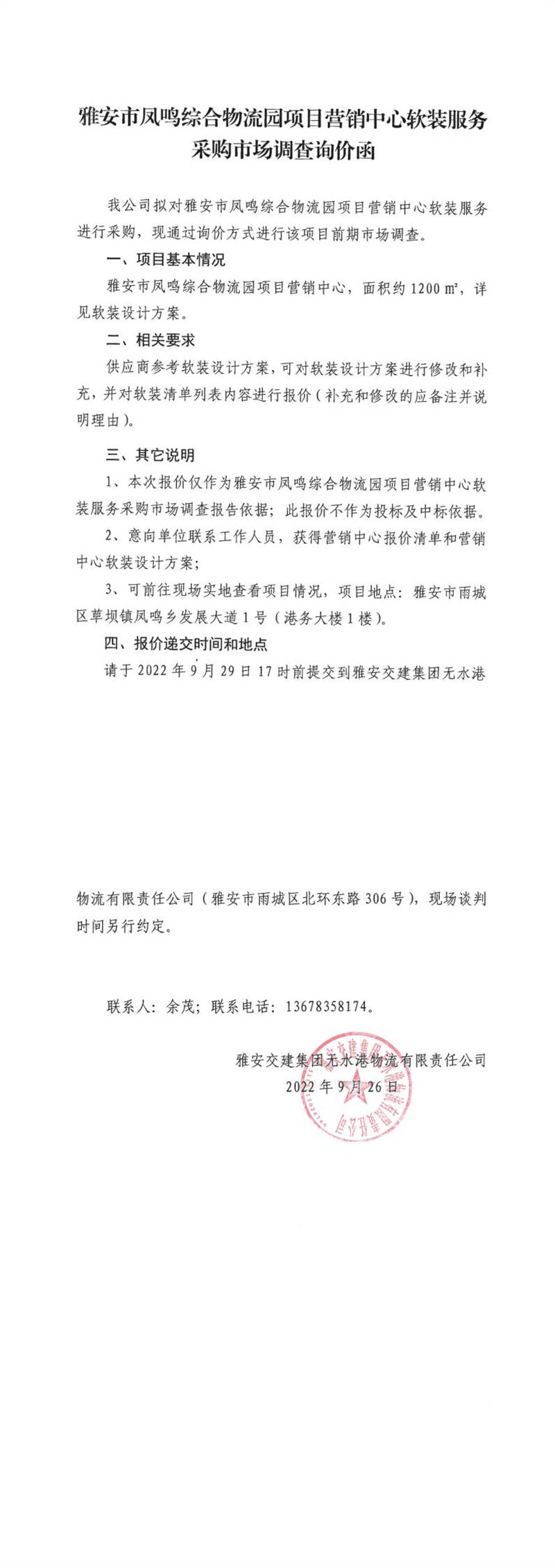 雅安交建集團無水港物流有限責任公司雅安市鳳鳴綜合物流園項目營銷中心軟裝服務采購市場調(diào)查詢價函
