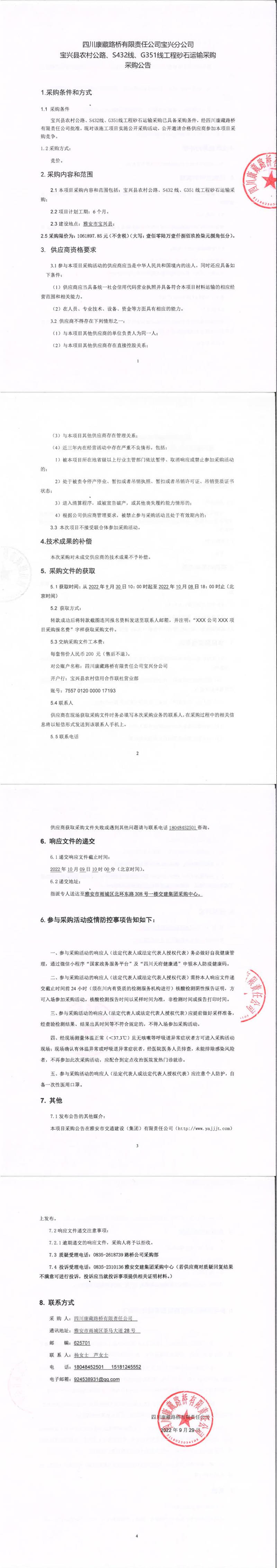 四川康藏路橋有限責(zé)任公司寶興分公司寶興縣農(nóng)村公路、S432線、G351線工程砂石運(yùn)輸采購采購公告