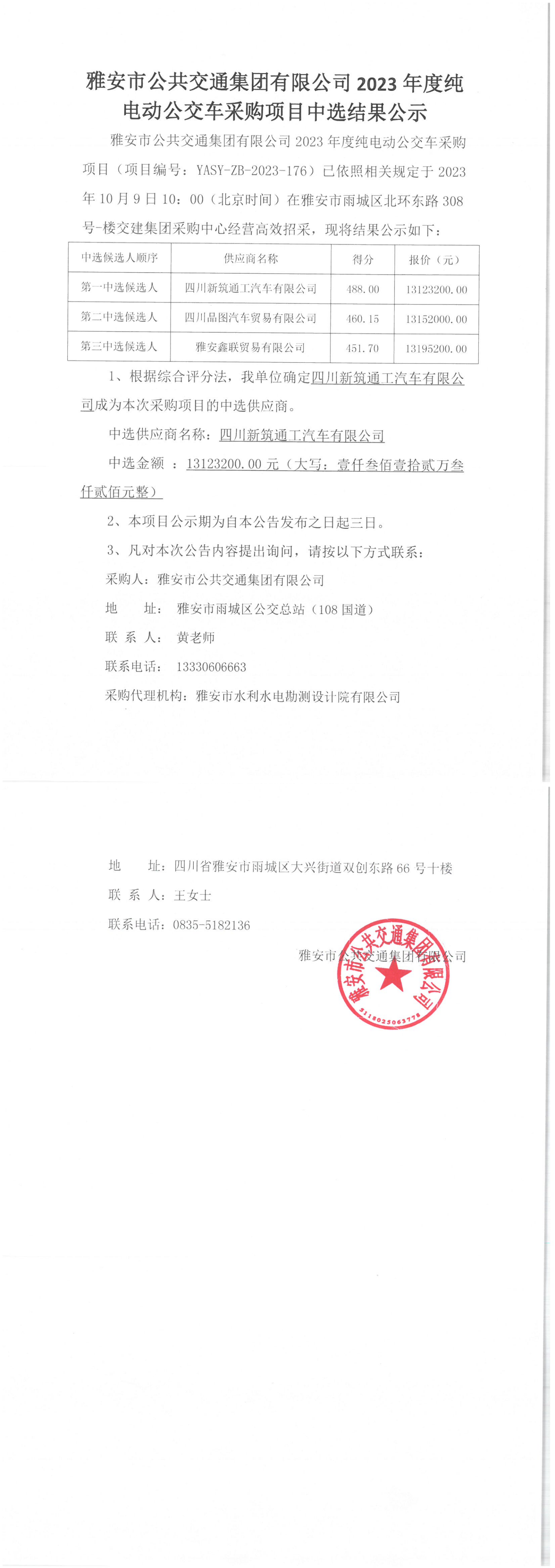 雅安市公共交通集團(tuán)有限公司2023年度純電動公交車采購項(xiàng)目中選結(jié)果公示