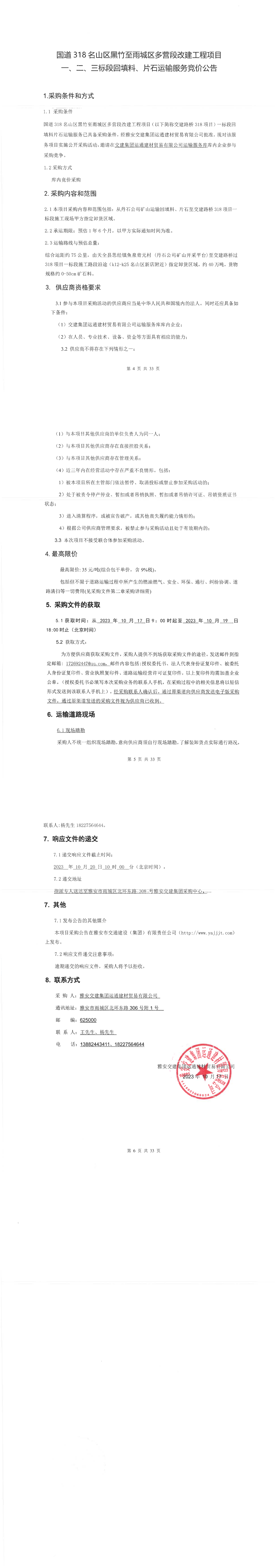 雅安交建集團運通建材貿(mào)易有限公司國道名山區(qū)黑竹至雨城區(qū)多營段改建工程項目一、二、三標(biāo)段回填料、片石運輸服務(wù)競價公告