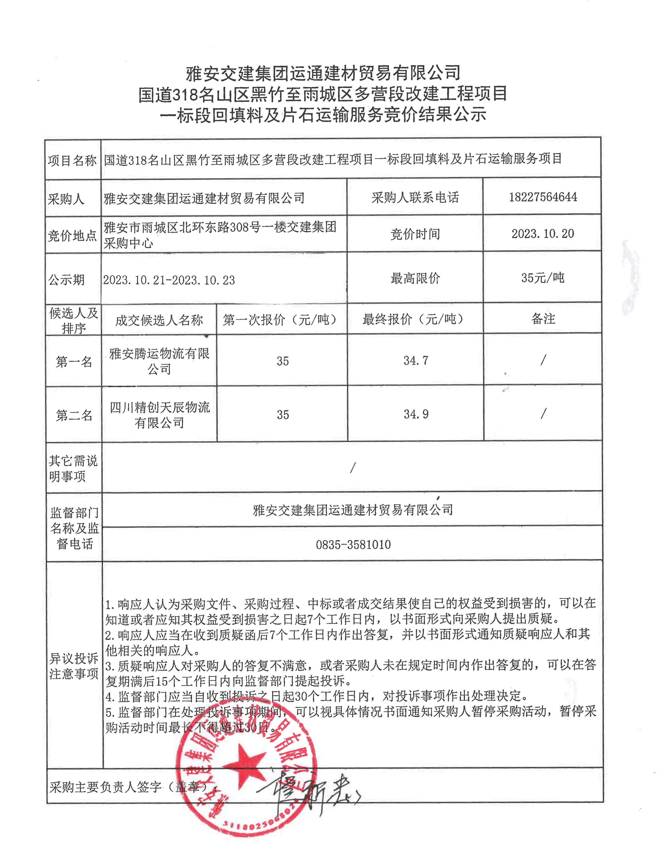 雅安交建集團運通建材貿(mào)易有限公司 國道318名山區(qū)黑竹至雨城區(qū)多營段改建工程項目一標段回填料及片石運輸服務(wù)競價結(jié)果公示