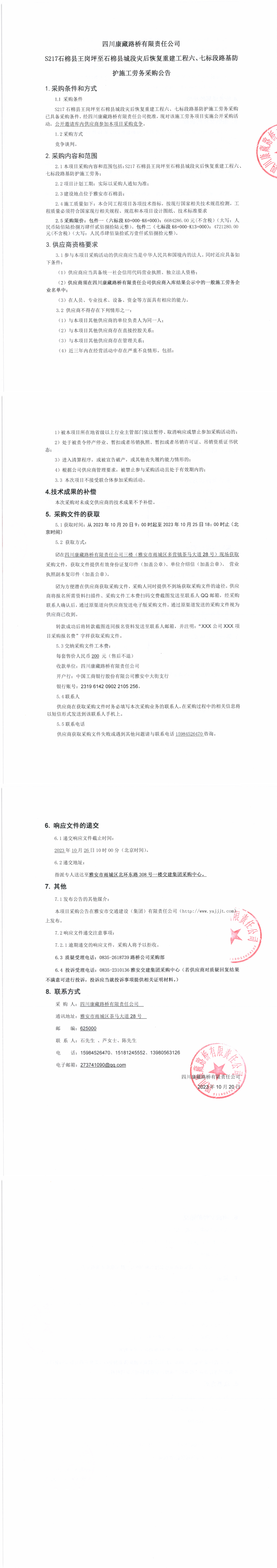 四川康藏路橋有限責(zé)任公司S217石棉縣王崗坪至石棉縣城段災(zāi)后恢復(fù)重建工程六、七標(biāo)段路基防護施工勞務(wù)采購公告