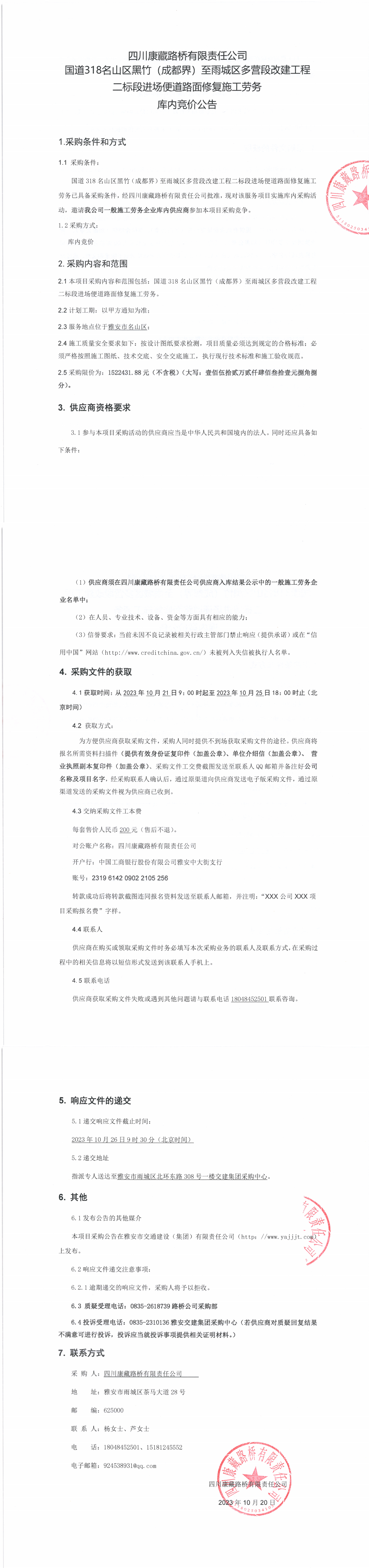 四川康藏路橋有限責(zé)任公司國道318名山區(qū)黑竹(成都界)至雨城區(qū)多營段改建工程二標(biāo)段進(jìn)場便道路面修復(fù)施工勞務(wù)庫內(nèi)競價(jià)公告