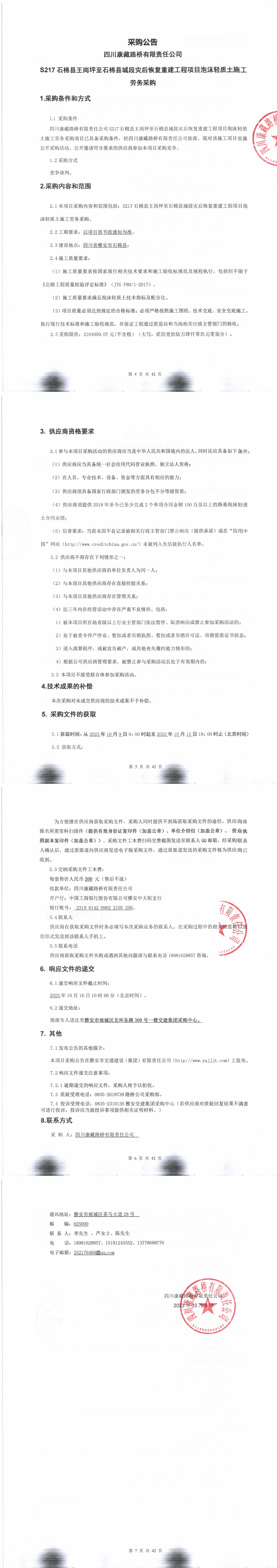 四川康藏路橋有限責任公司S217石棉縣王崗坪至石棉縣城段災(zāi)后恢復(fù)重建工程項目泡沫輕質(zhì)土施工勞務(wù)采購公告