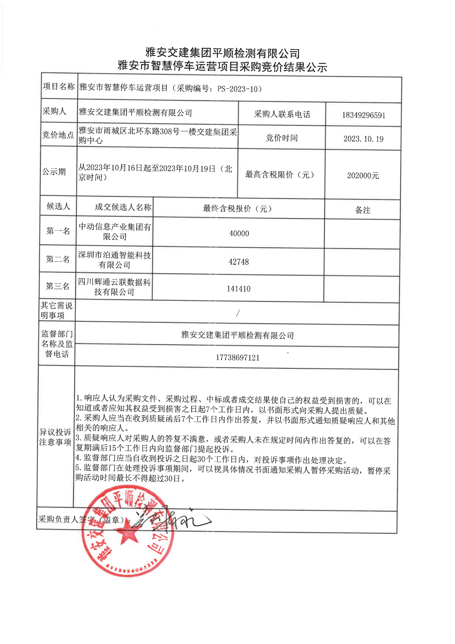 雅安交建集團(tuán)平順檢測有限公司雅安市智慧停車運營項目采購競價結(jié)果公示