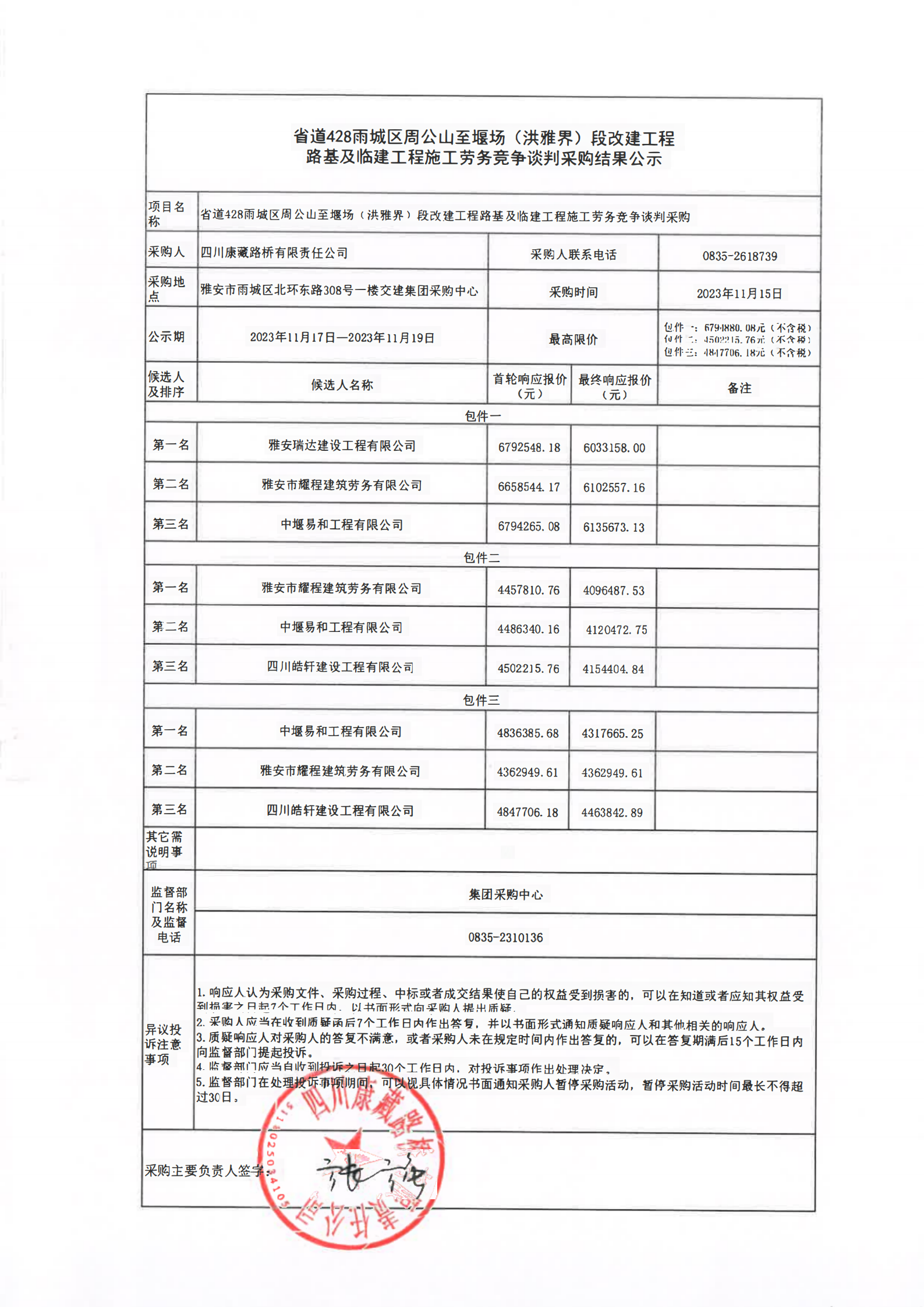 四川康藏路橋有限責(zé)任公司省道428雨城區(qū)周公山至堰場(chǎng)(洪雅界)段改建工程路基及臨建工程施工勞務(wù)競(jìng)爭(zhēng)談判采購(gòu)結(jié)果公示