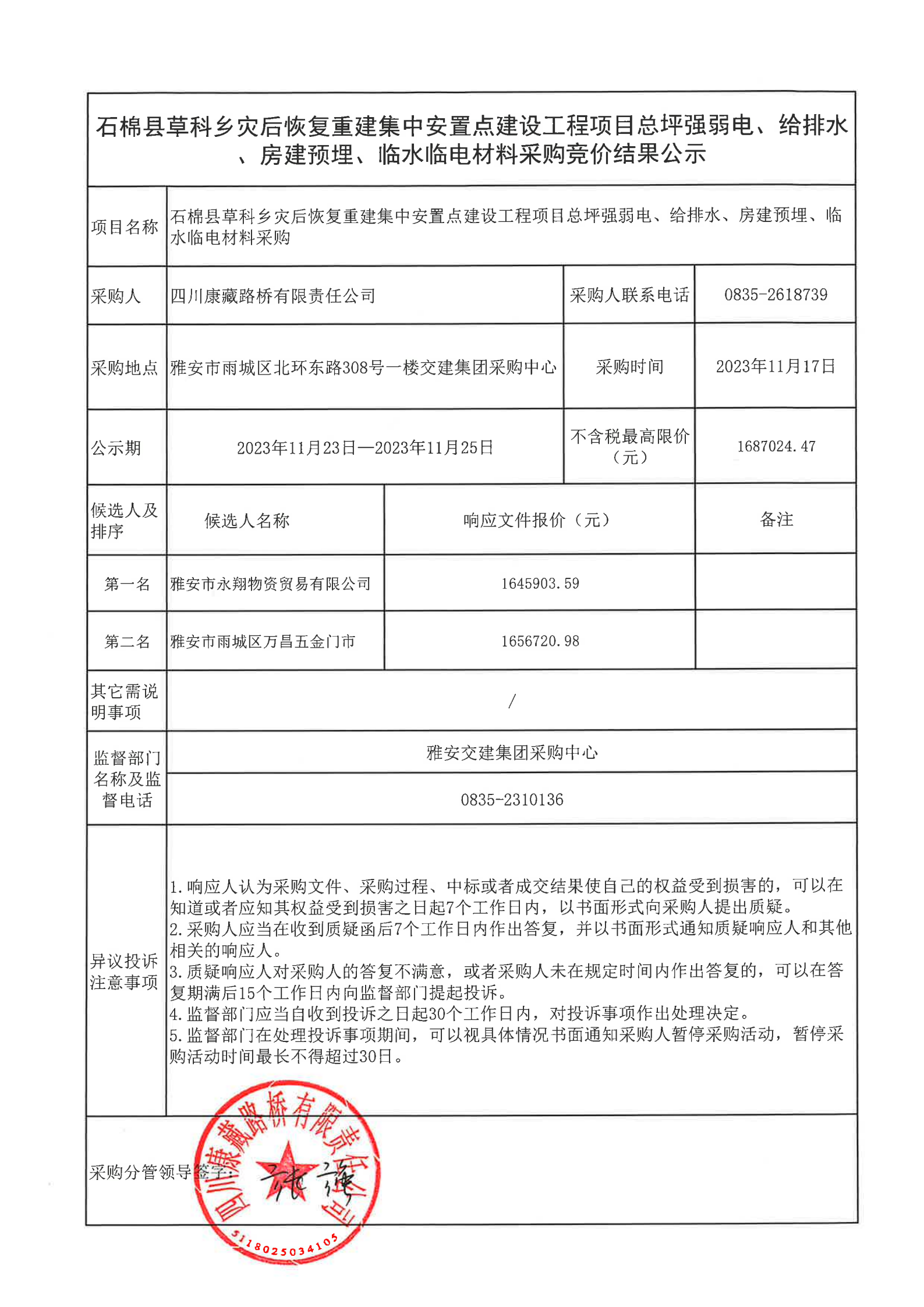 四川康藏路橋有限責(zé)任公司石棉縣草科鄉(xiāng)災(zāi)后恢復(fù)重建集中安置點建設(shè)工程項目總坪強(qiáng)弱電、給排水、房建預(yù)埋、臨水臨電材料采購結(jié)果公示