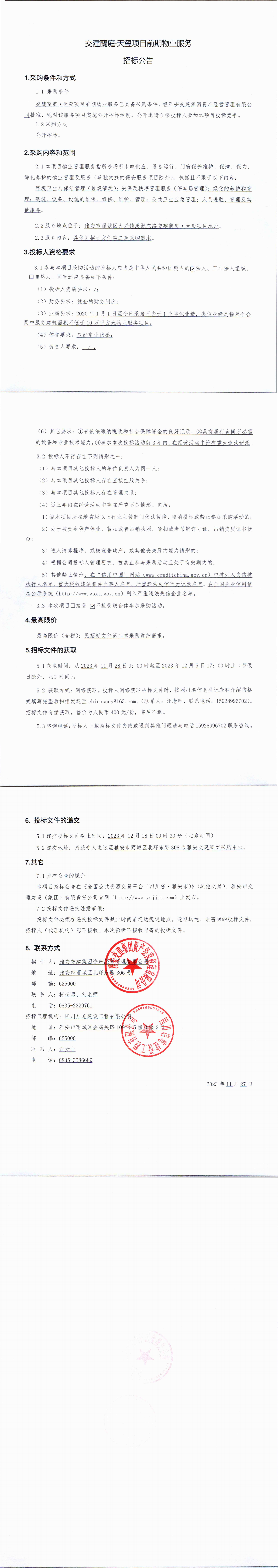 雅安交建集團(tuán)資產(chǎn)經(jīng)營管理有限公司交建蘭庭·天璽項(xiàng)目前期物業(yè)服務(wù)招標(biāo)公告