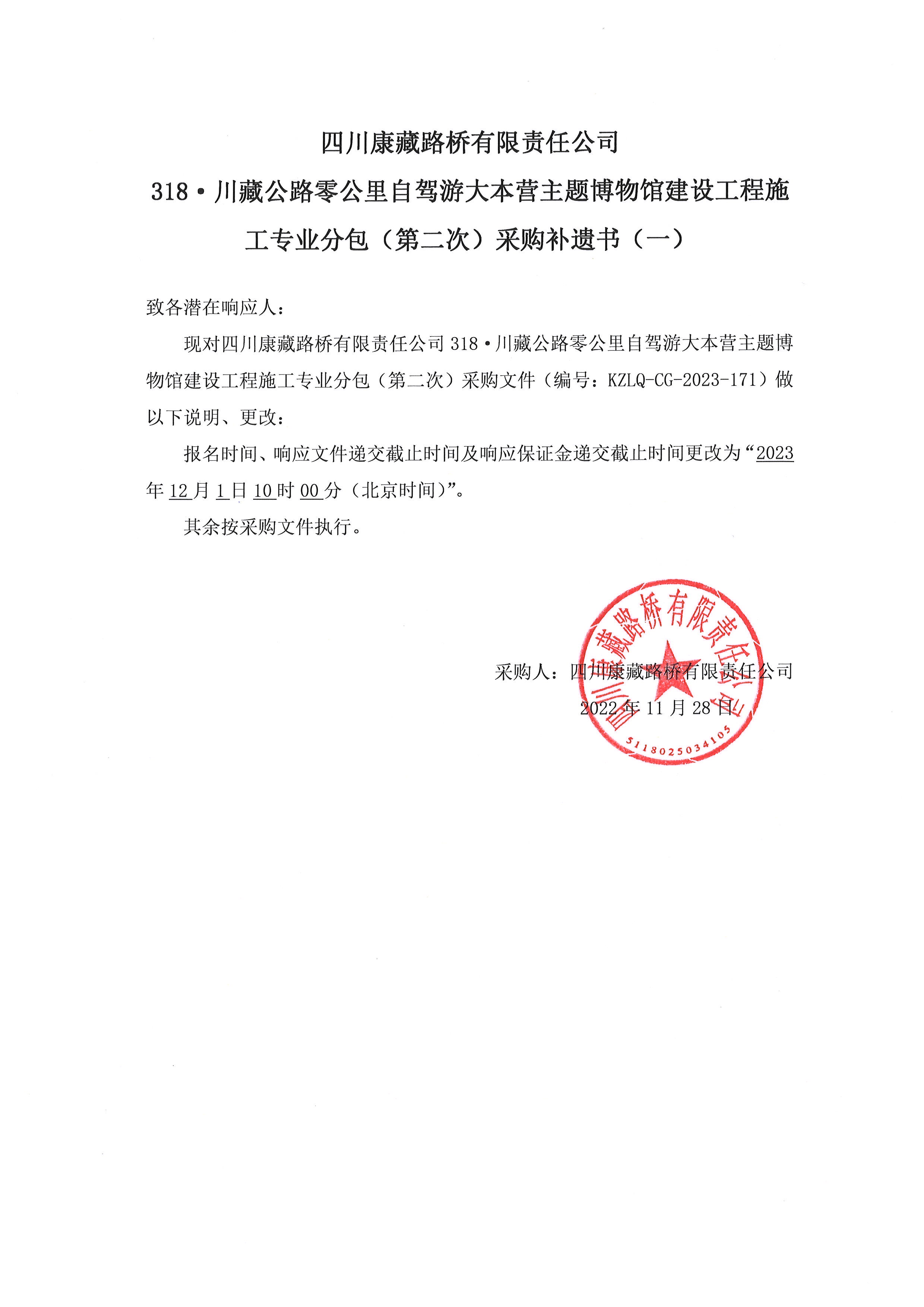四川康藏路橋有限責(zé)任公司318·川藏公路零公里自駕游大本營(yíng)主題博物館建設(shè)工程施工專業(yè)分包(第二次)采購(gòu)補(bǔ)遺書(一)