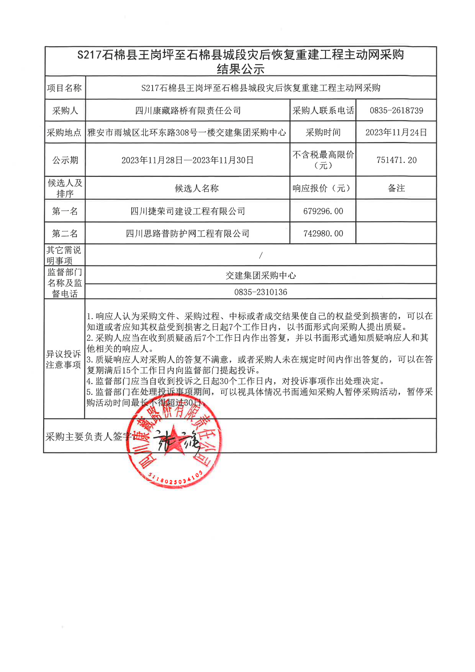 四川康藏路橋有限責(zé)任公司S217石棉縣王崗坪至石棉縣城段災(zāi)后恢復(fù)重建工程主動網(wǎng)采購結(jié)果公示